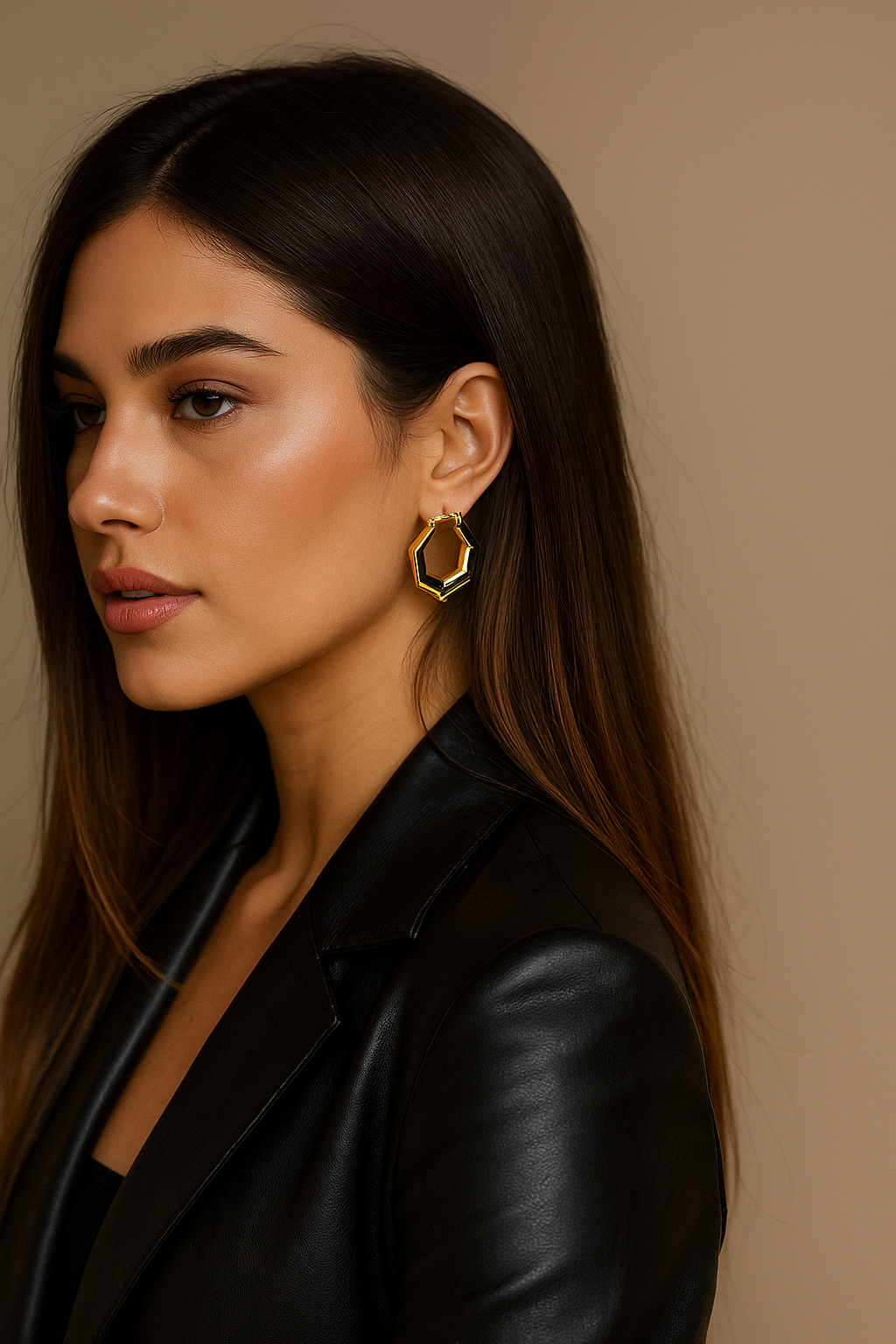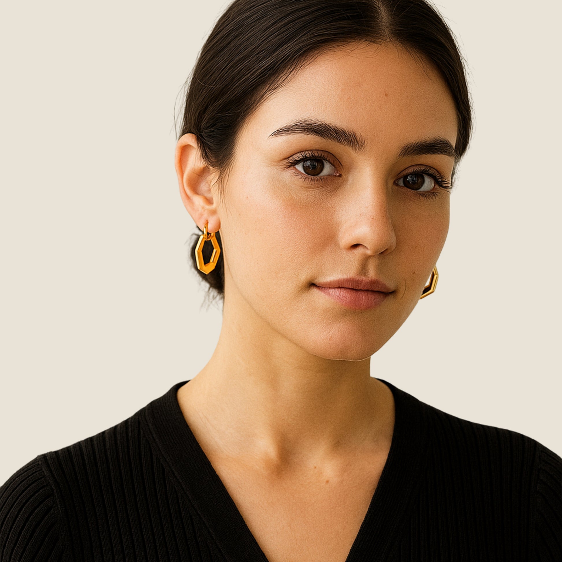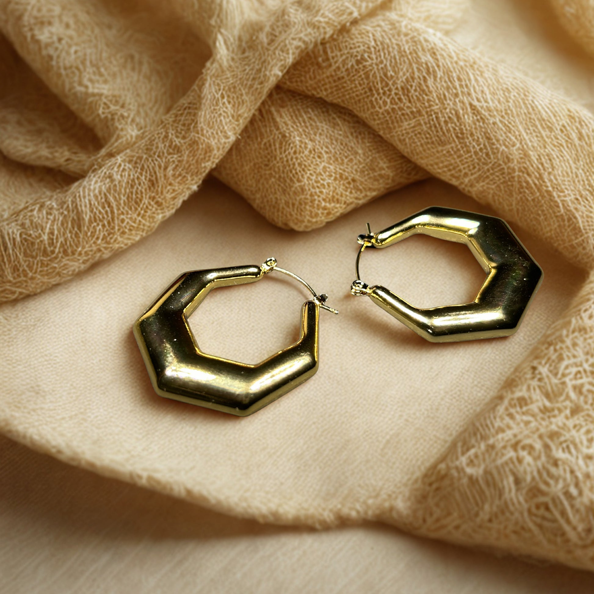Turn heads with our Anti-Tarnish Geometric Hoop Earrings, designed for modern elegance and lasting shine. Crafted with a premium anti-tarnish coating, these gold-finish hoops resist fading, keeping their brilliance wear after wear. The unique angular design adds a chic twist to the classic hoop, making them perfect for casual outings, office looks, or special occasions. Lightweight, durable, and skin-friendly—your go-to accessory for effortless style.