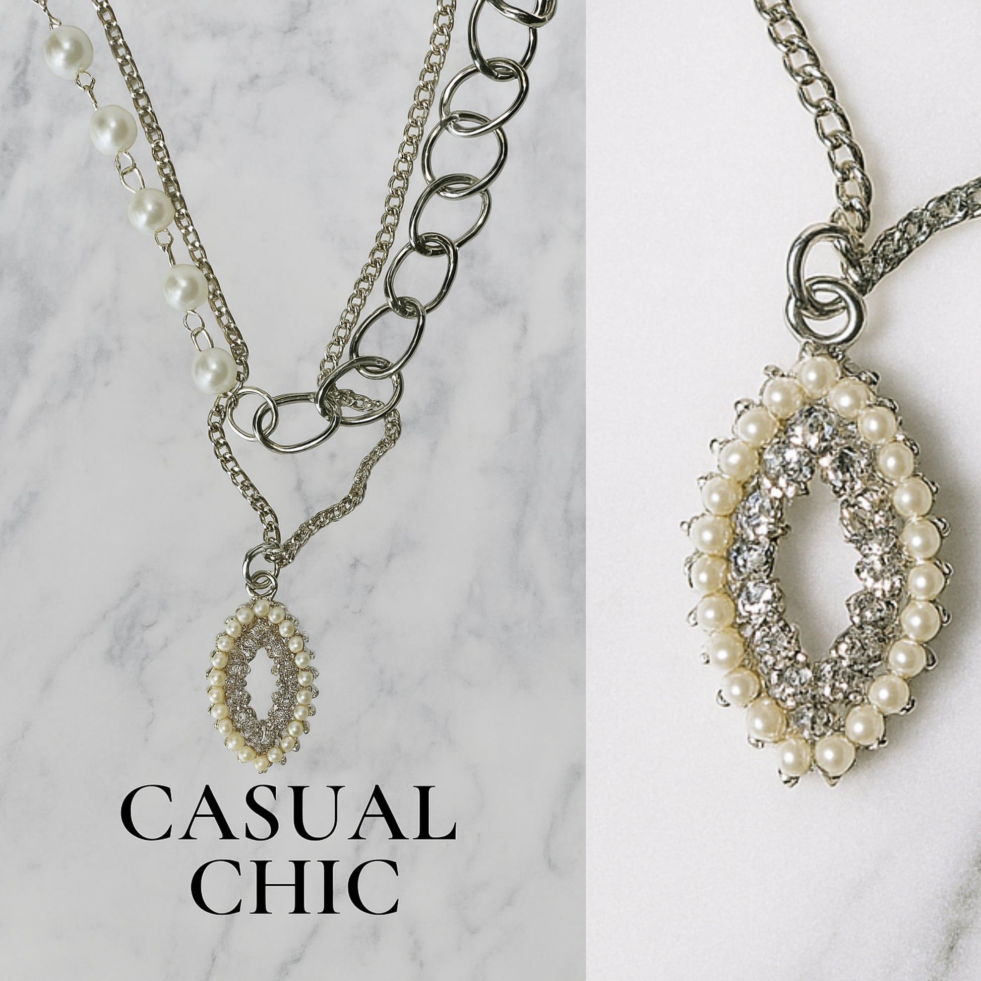 Make a statement with this stunning Chunky Link and Pearl Statement Necklace. It perfectly blends modern and classic styles, featuring a bold, chunky silver-tone chain on one side and a delicate string of imitation pearls on the other. The look is completed with a beautiful oval pendant, framed with sparkling crystals and matching pearls. This necklace is the perfect accessory to elevate any outfit, from casual to formal.