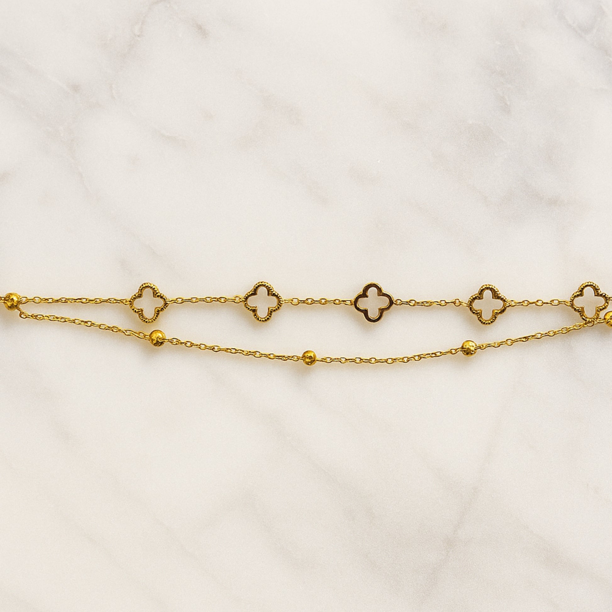 This elegant, double-layered bracelet is perfect for everyday wear. The top chain features detailed clover charms, while the lower chain is adorned with delicate gold beads, creating a beautiful layered look. It's made with anti-tarnish material to keep it looking new. Plus, it comes with a 6-month warranty for your peace of mind.