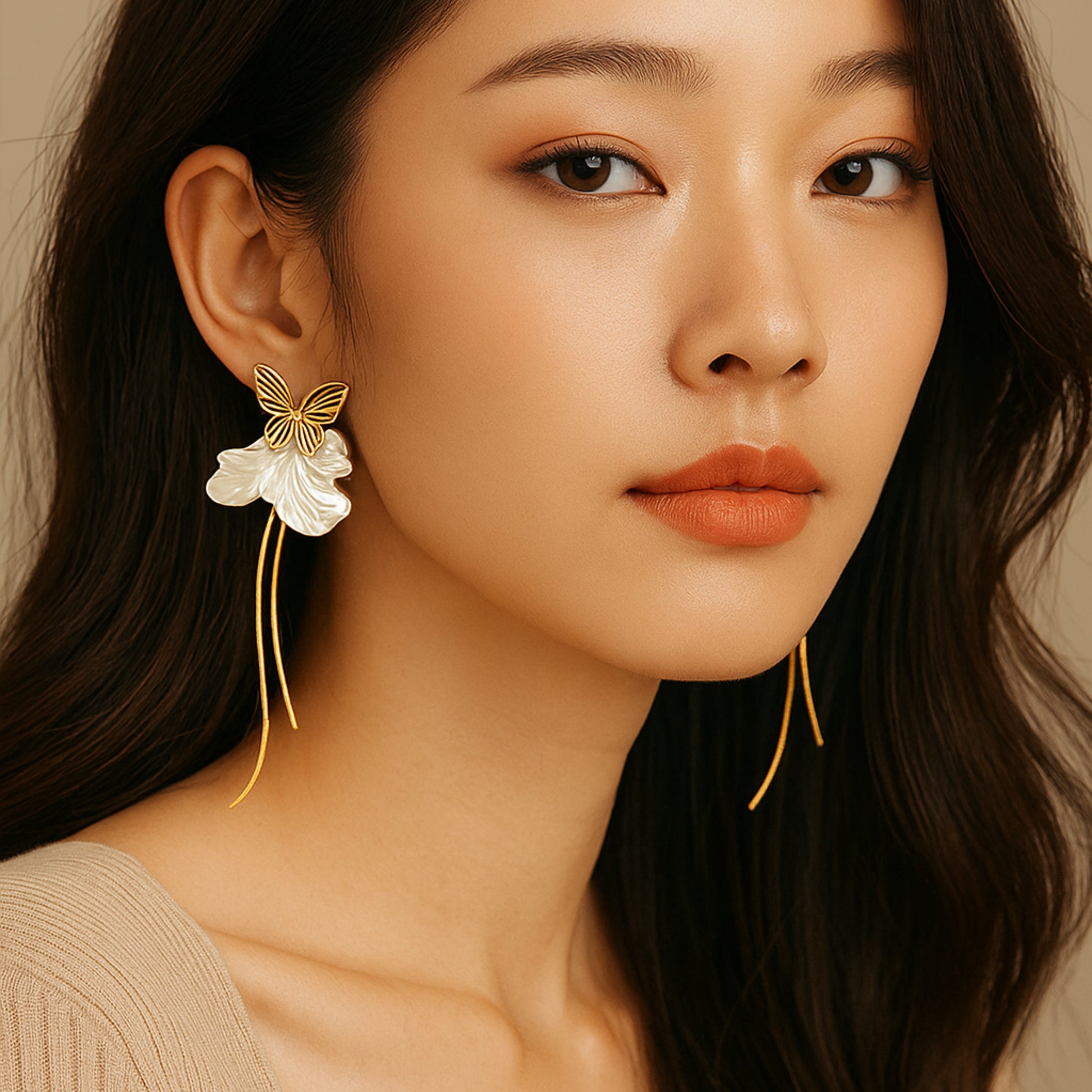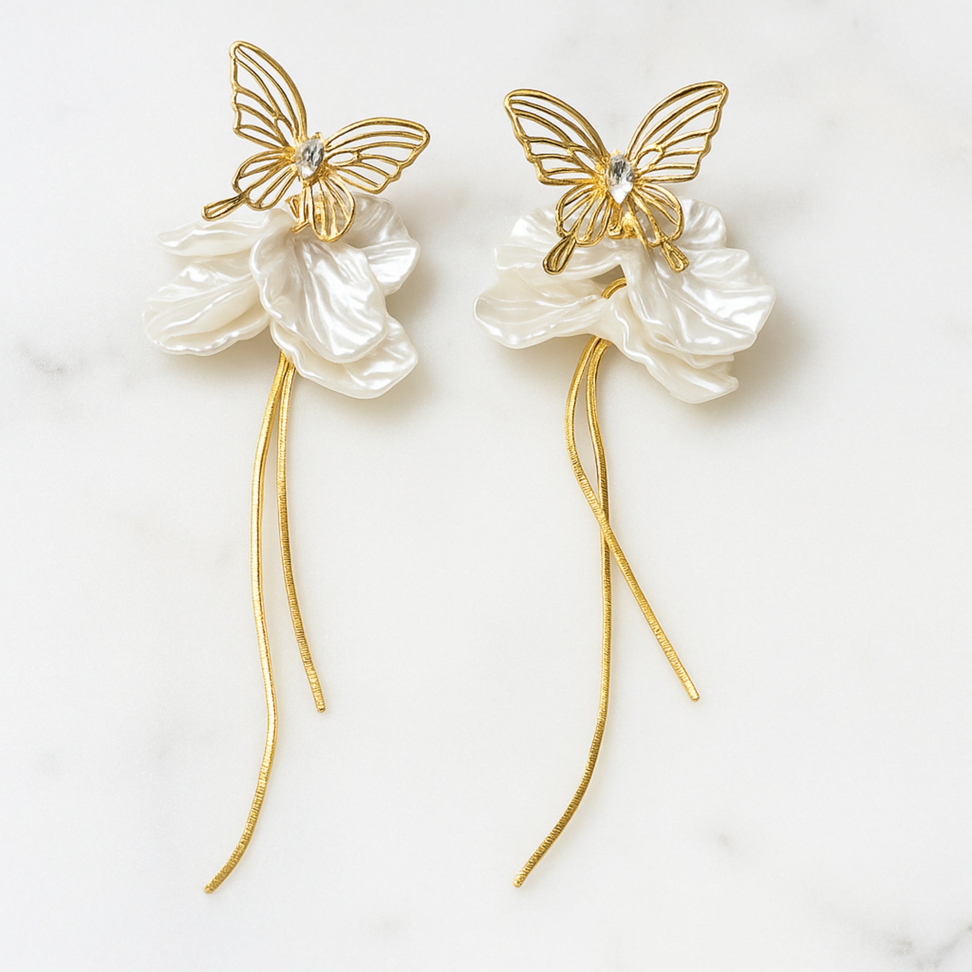 Each earring features a meticulously crafted, gold-toned butterfly with a sparkling center, symbolizing transformation and beauty. The butterfly rests upon a cluster of three elegant, sculpted petals that mimic the soft, luminous sheen of pearls. Below, a pair of delicate, flowing chains sways with every movement, creating a captivating and graceful silhouette.