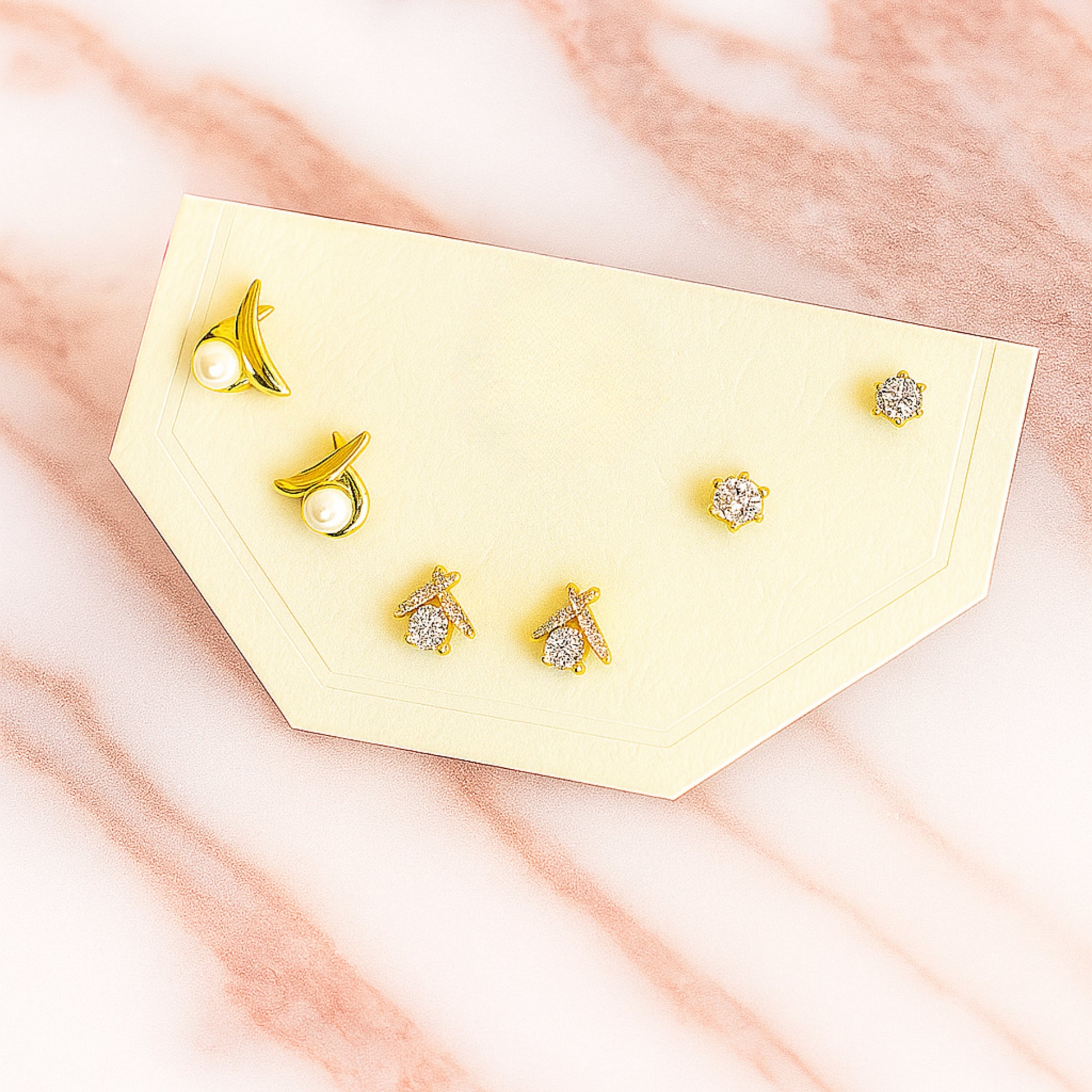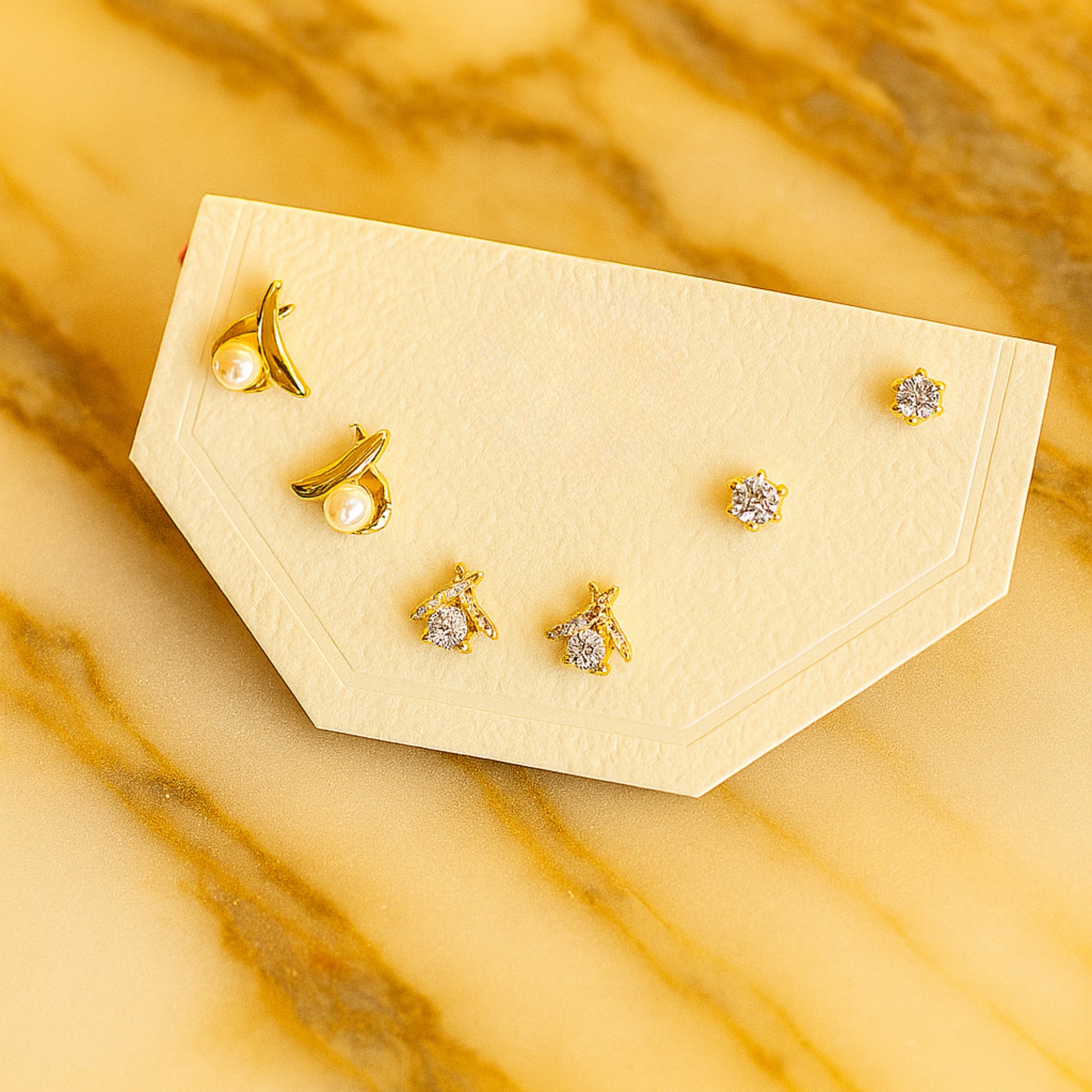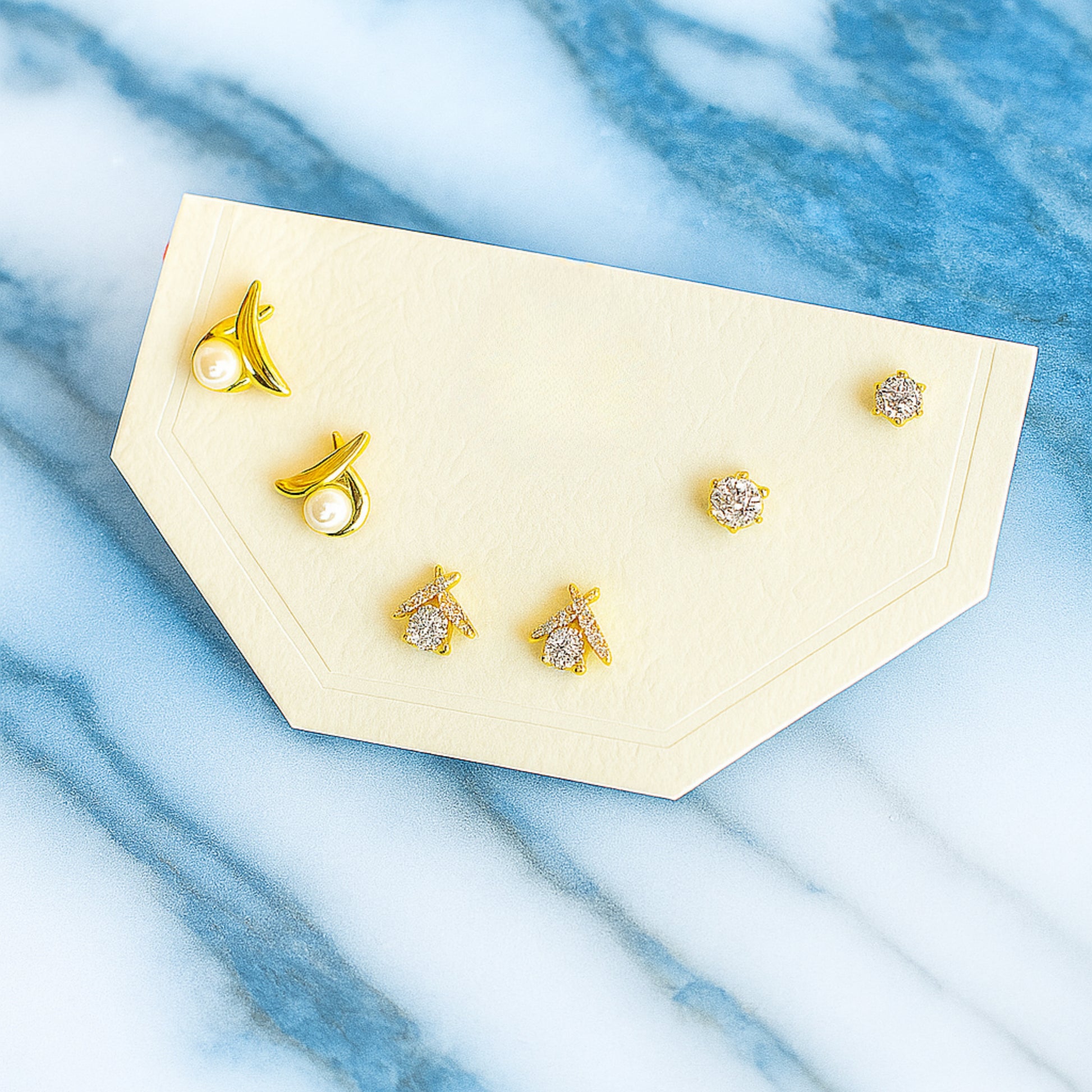 Shine bright with The Celestial Brilliance Trio. This anti-tarnish set is crafted for durability and features a captivating pair of U-shaped earrings with dazzling stones and two pairs of miniature star studs. Perfect for creating a curated ear stack or wearing individually. Guaranteed against tarnishing for 6 months.
