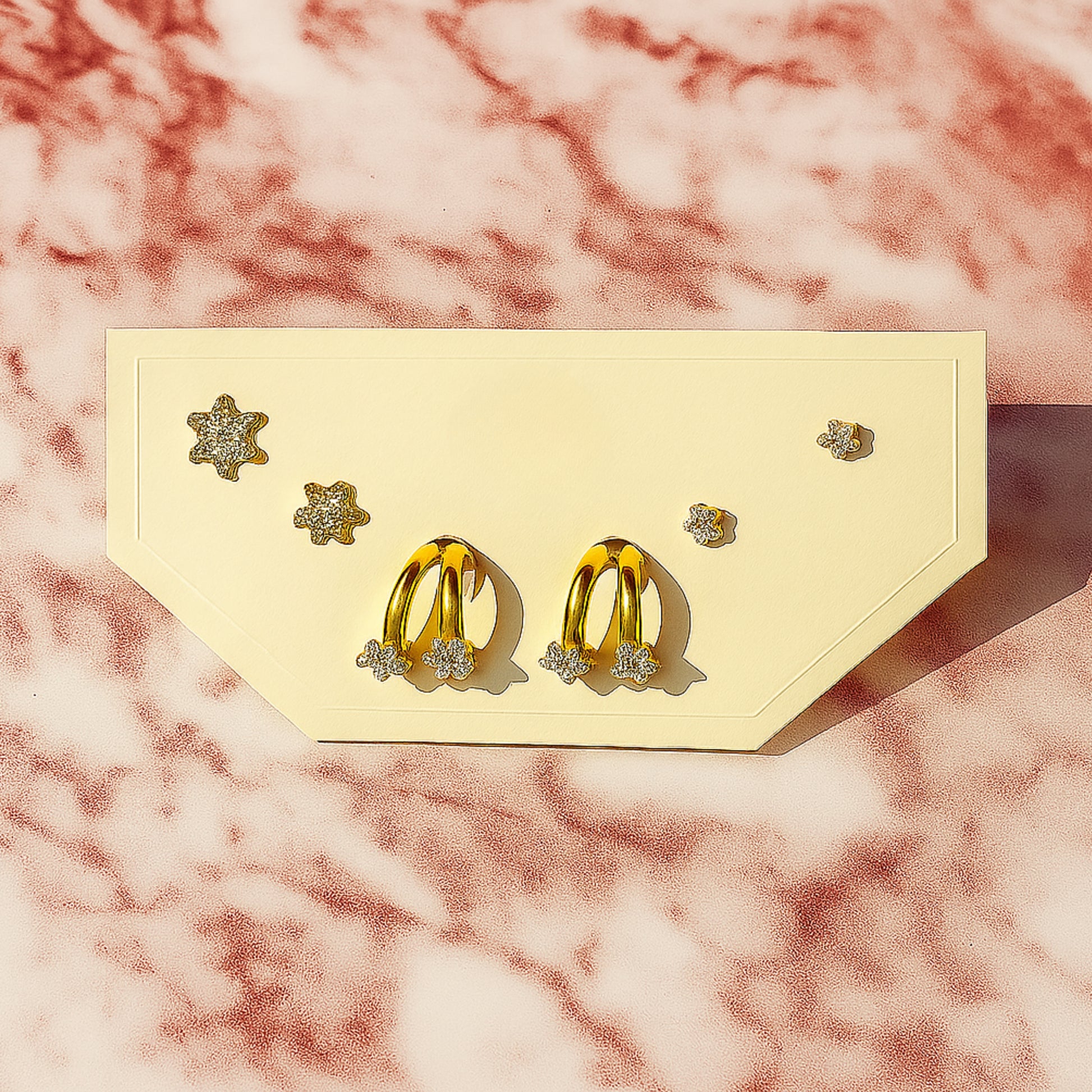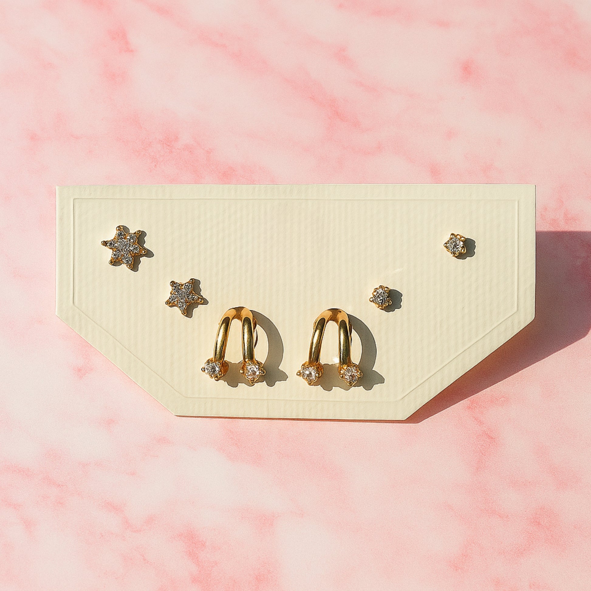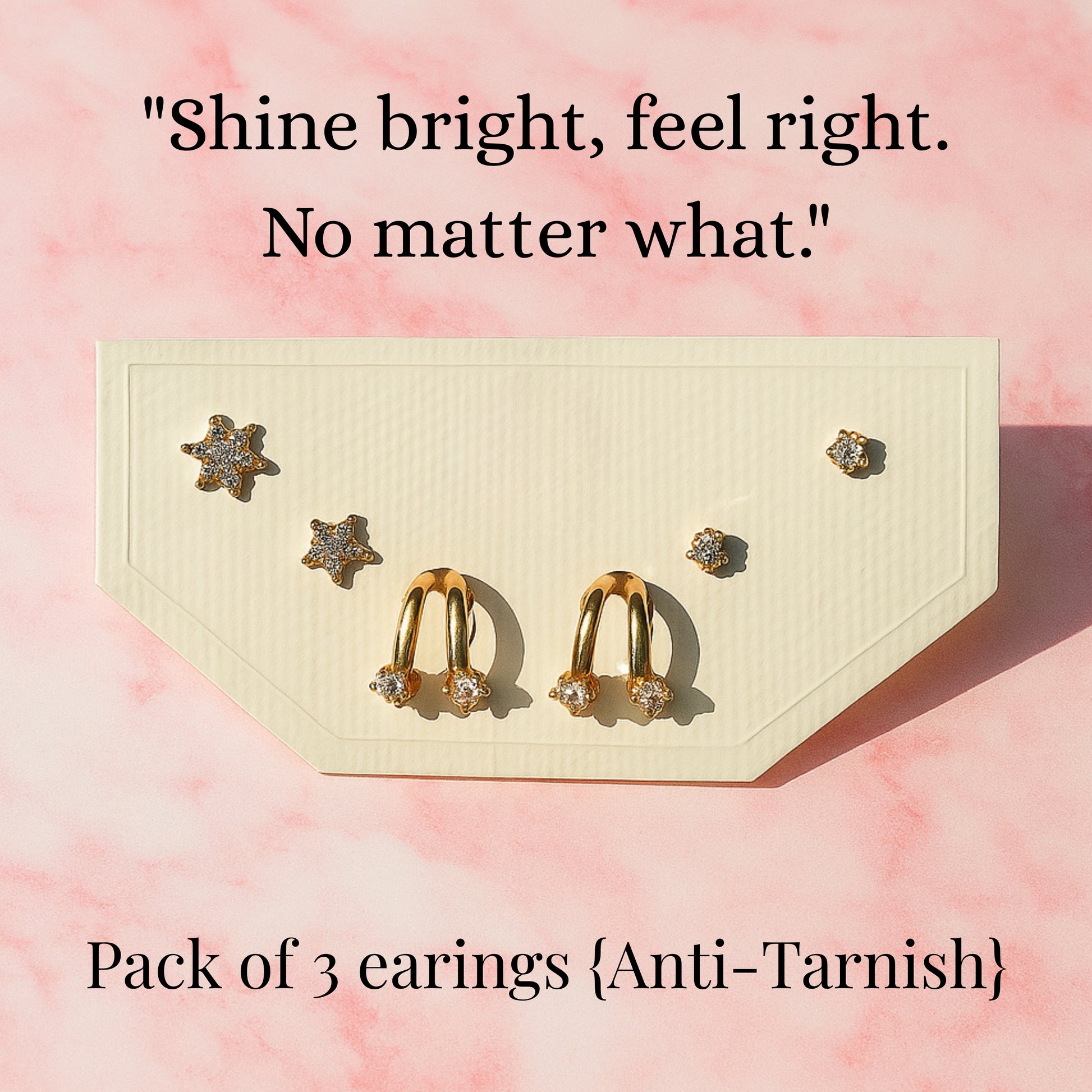 Our new go-to for daily elegance. This pack of three anti-tarnish earrings includes a pair of stylish CZ-encrusted hoops and two pairs of complementary star studs. Durable enough for everyday wear and designed to retain their shine. Comes with a 6-month warranty for your peace of mind.