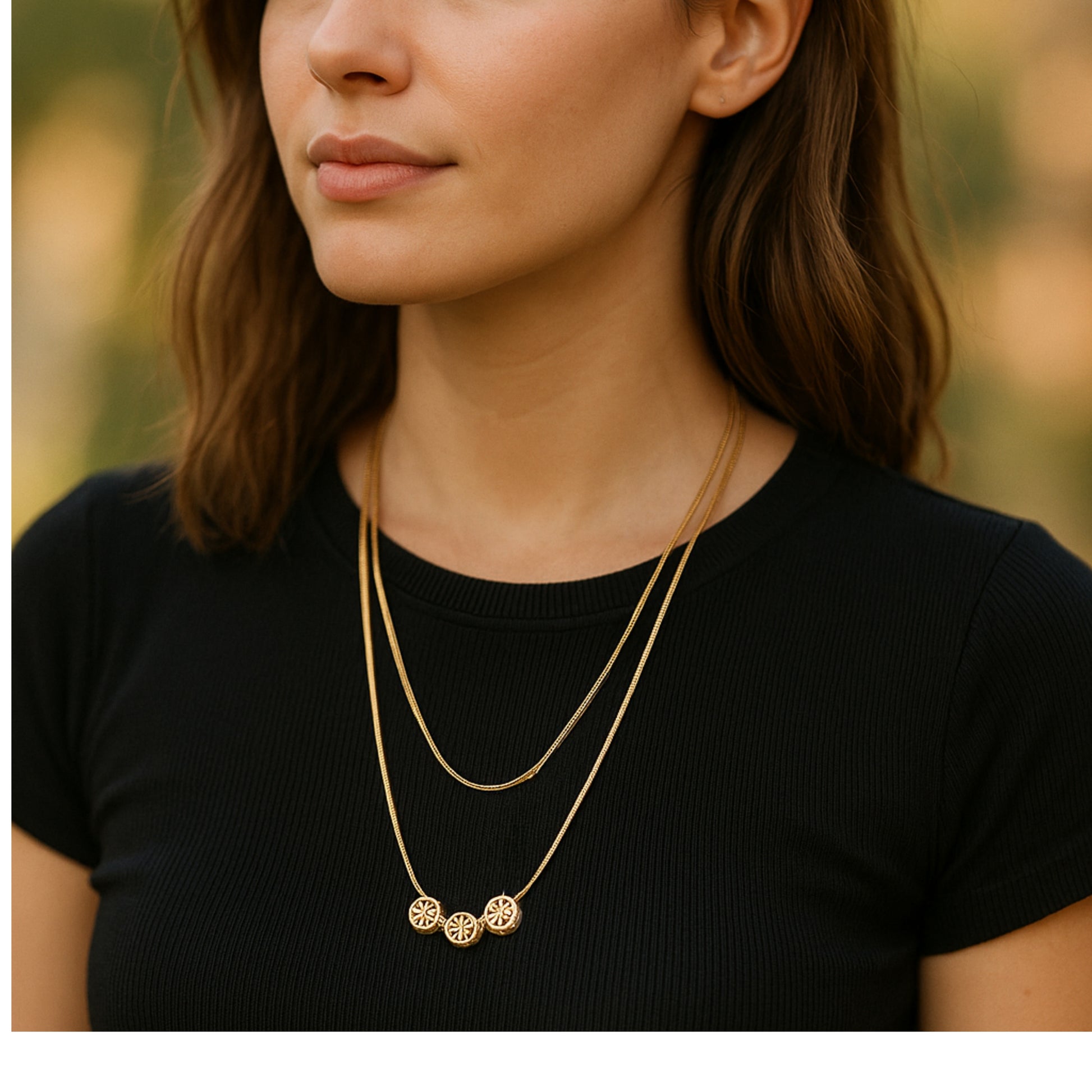 Add a touch of modern sophistication with The Golden Aura Necklace. This latest design features a fine chain adorned with a series of polished disc charms. It’s the perfect piece for layering or wearing on its own. Made with a complete anti-tarnish finish, this necklace is built for lasting wear and is backed by our 6-month warranty.