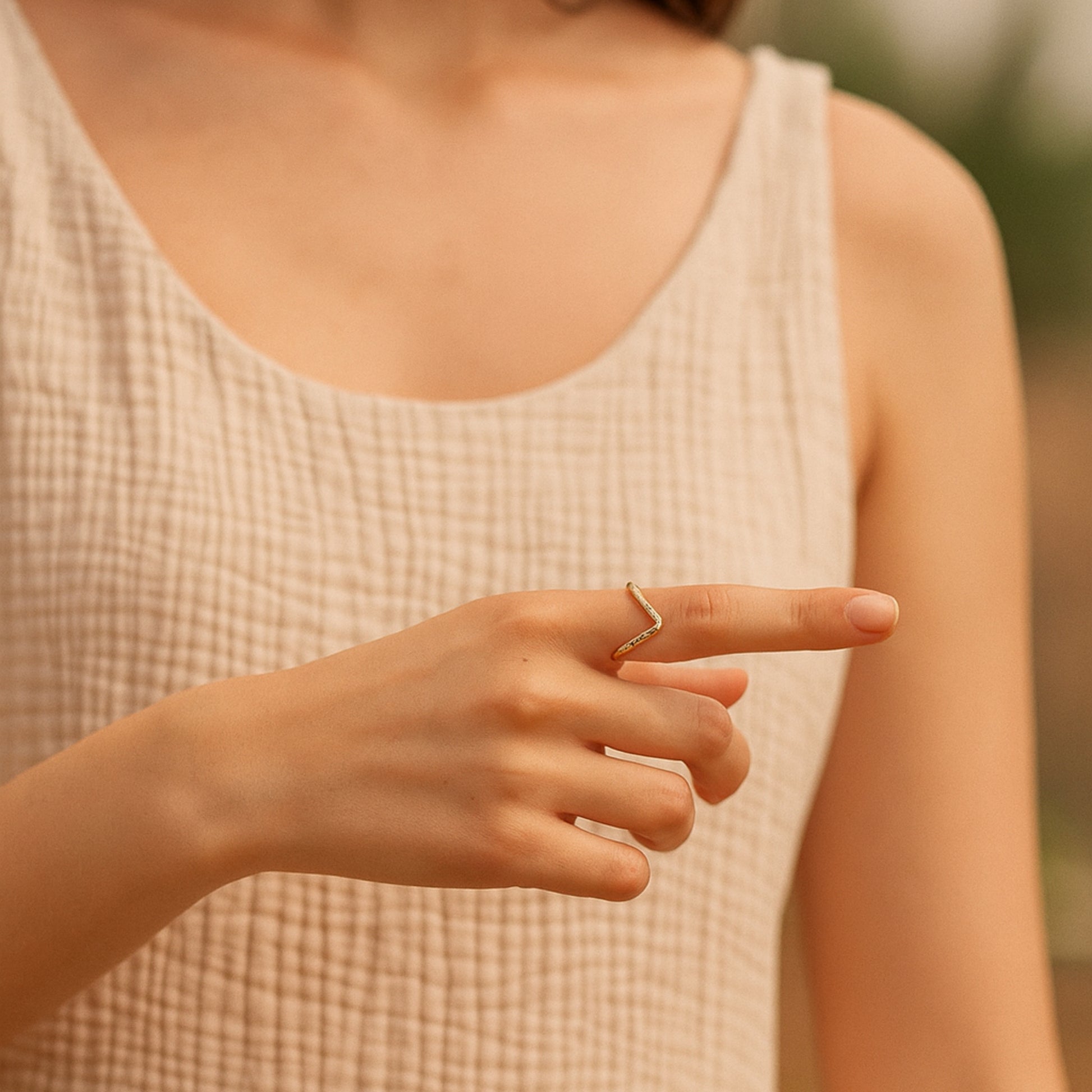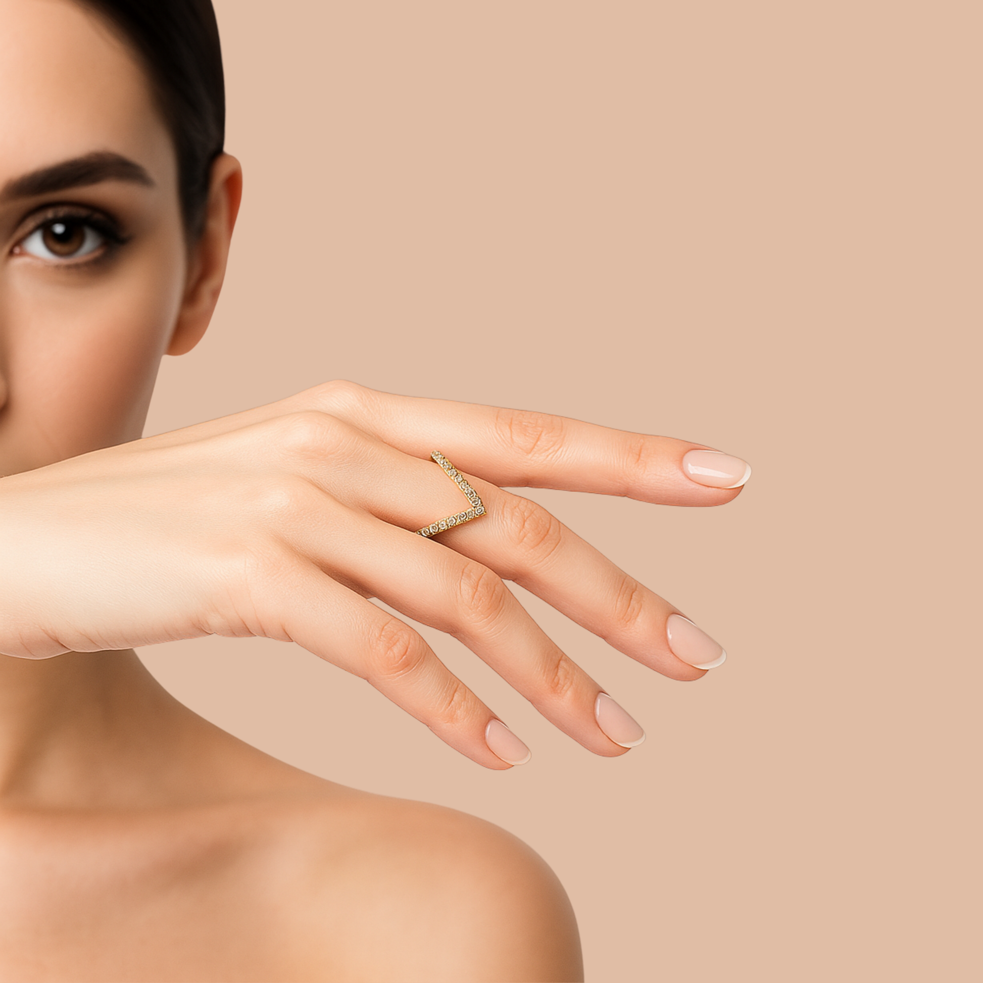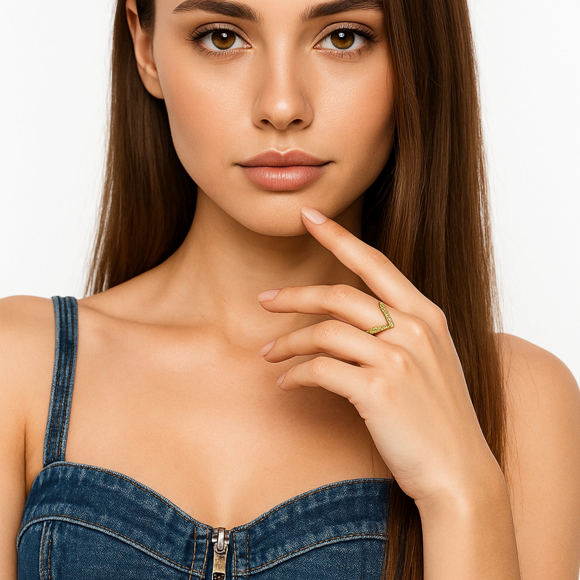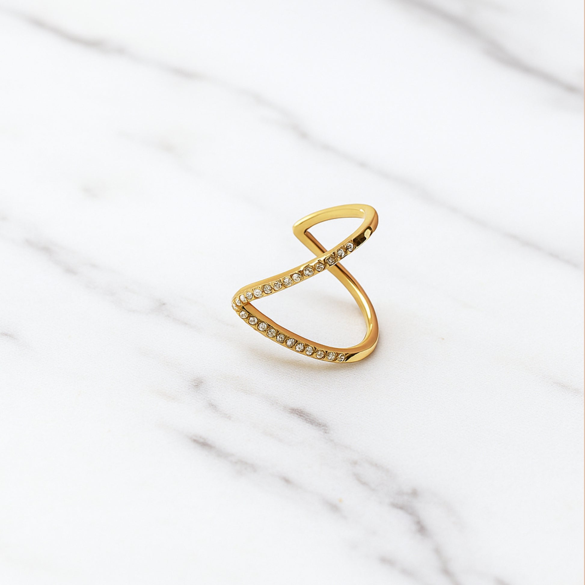 Make a statement with the Lumina Eternity Ring. This exquisite piece captures light from every angle, with a dazzling line of stones set on a beautifully sculpted gold-toned band. Its intricate, intertwined design is matched by its superior craftsmanship. It comes with a 6-month anti-tarnish guarantee, ensuring its flawless brilliance will last for years to come.