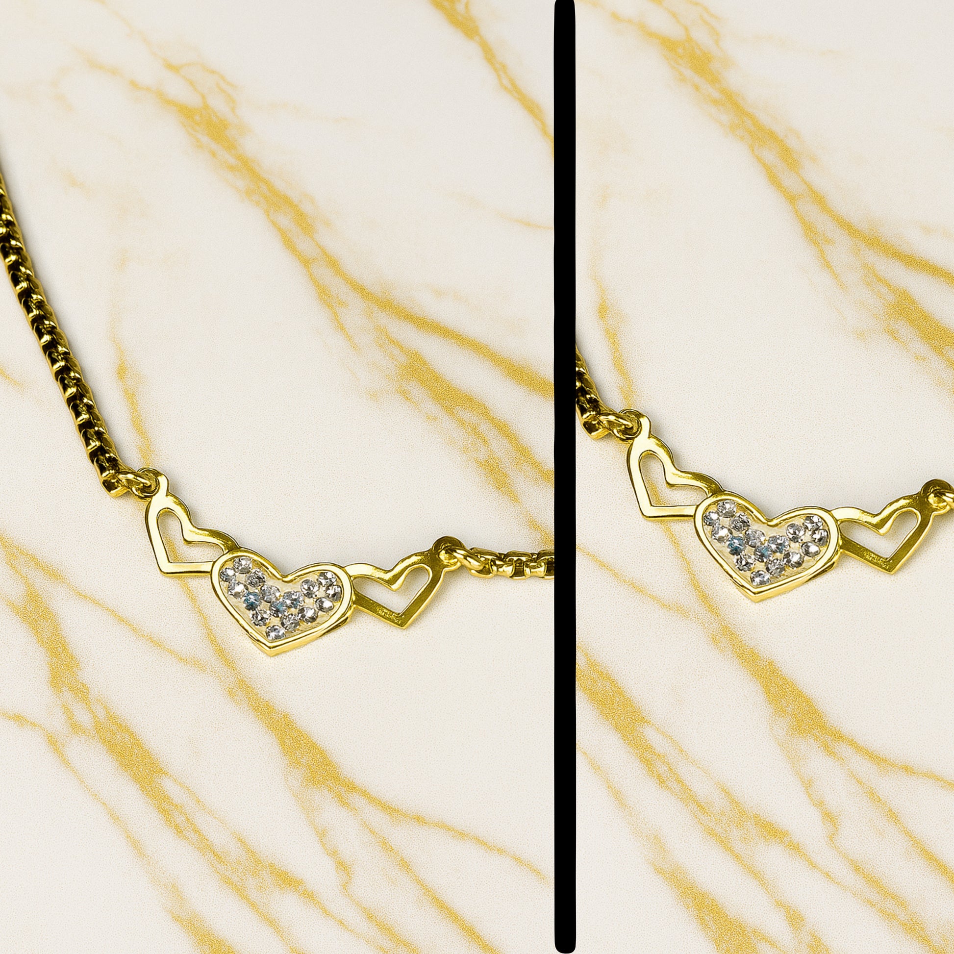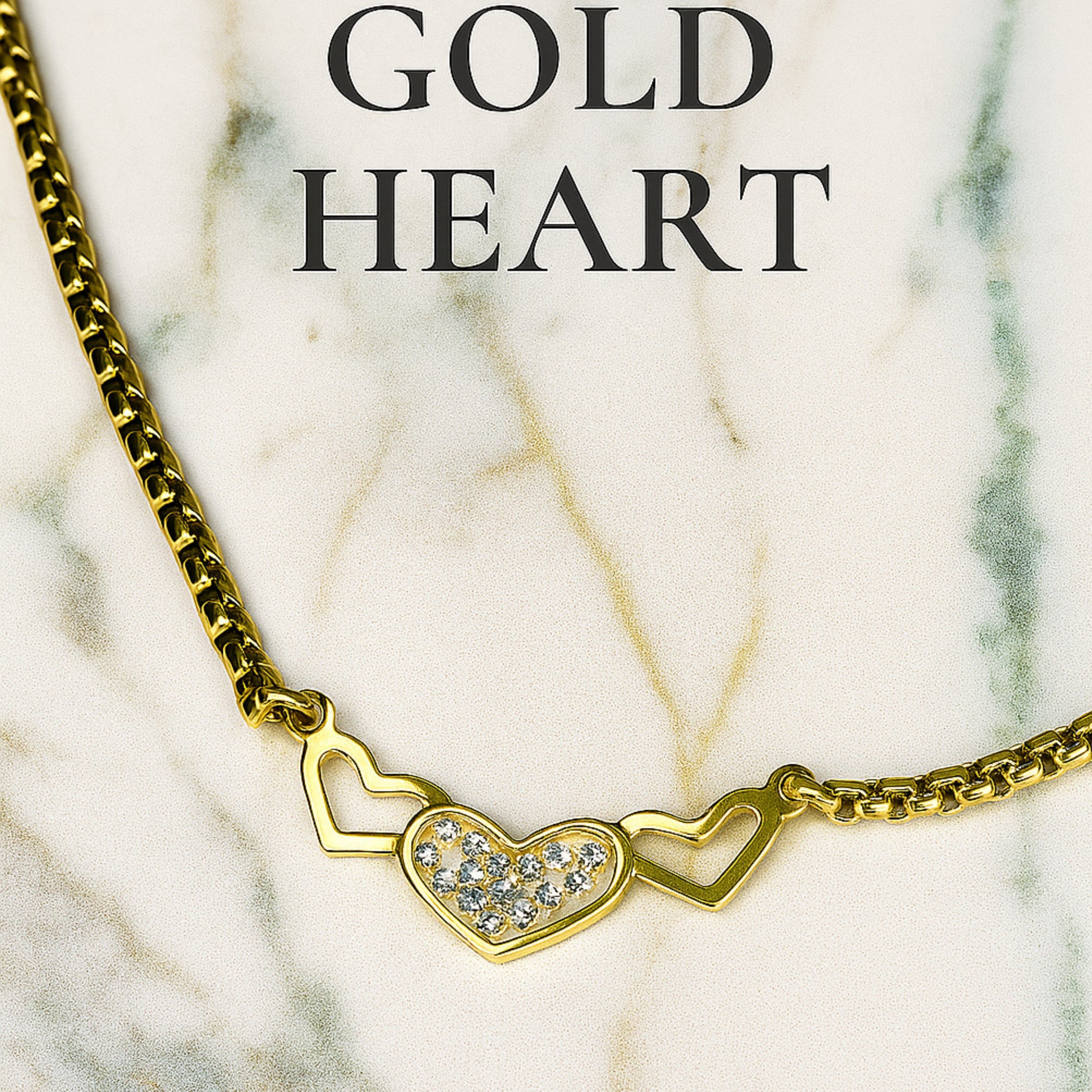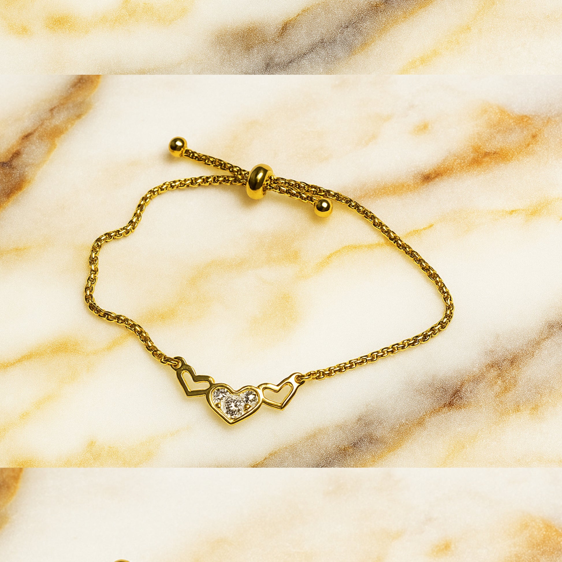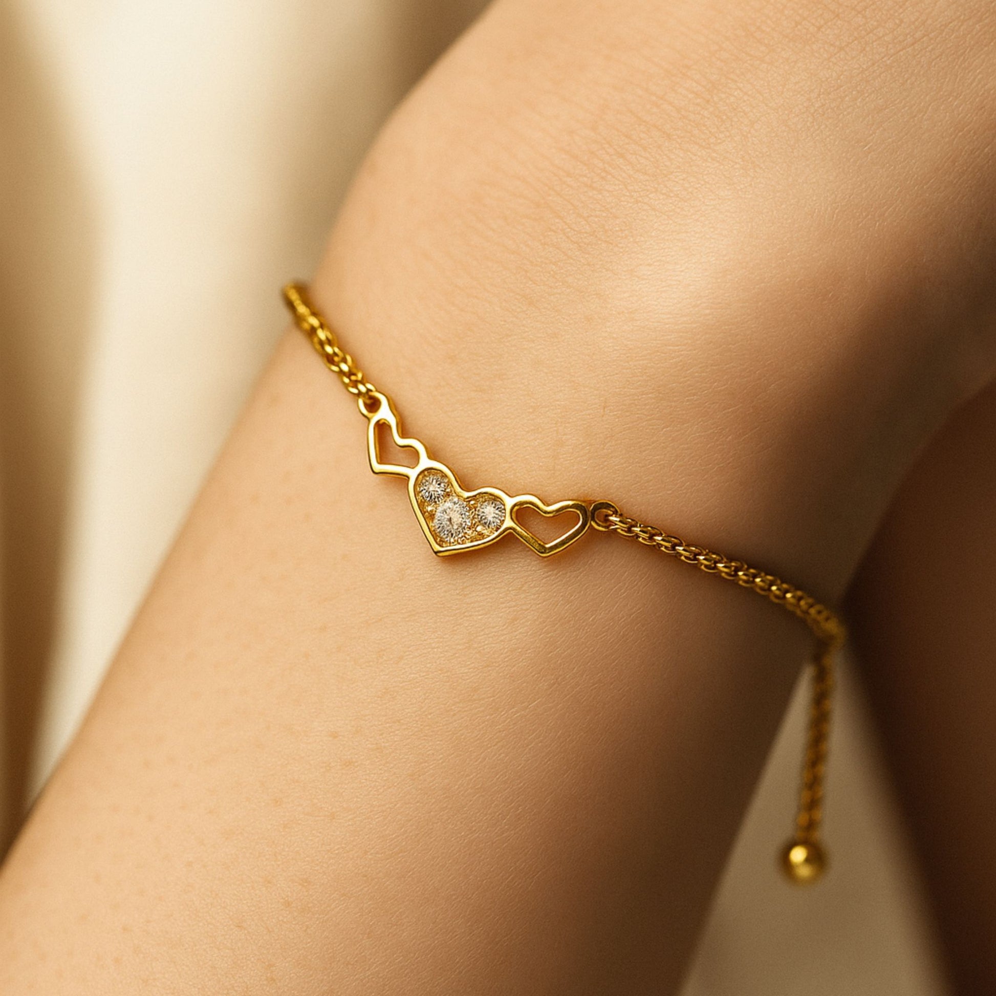 Elevate your style with our elegant Tri-Heart Sparkle Gold Bracelet, a delicate yet dazzling piece that combines timeless romance with modern sophistication. Crafted with precision, this adjustable gold-toned chain features three interconnected heart charms — two open hearts framing a central heart set with sparkling cubic zirconia stones, symbolizing love, connection, and beauty.